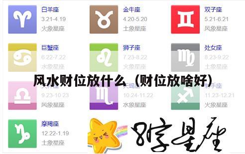 可摆放花瓶、风水轮、鱼缸、财神、元宝、宝瓶、三羊开泰图、山水图、如意、聚宝盆、百字明咒、菠萝、抽子、桔子、盆裁、花艺、发财树、富贵竹、鸡血石、丰收图、年年如愈图、本命三合生肖陶艺品、鱼缸、珍玩、财神、麒麟一对、水晶阵、檀香、水晶阵、福禄寿三仙、土地公等。财位摆放上述吉祥物一般没有太多禁忌可依各人喜好摆放,也可根据图的差别摆放,其目的不外乎想借助吉祥物的寓意以增加福泽。