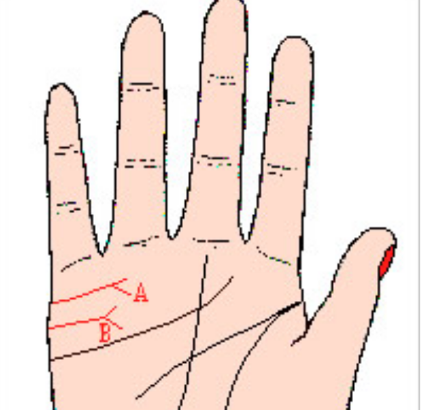 由结合线分出小小线条的尖端,在太阳丘下面下垂的人(记号A),是夫妇缘份较差,可能由于对方病弱或性格有缺点,以致自己被拖累而命运欠佳,这类人总是不停批评对方,说对方的是非,但是却不致于马上分离。