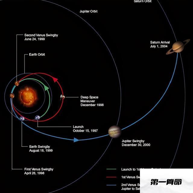 卡西尼号在发射第一次离开地球之后并没有直接奔向土星,而是首先飞掠过了金星,获得了金星引力提供的加速,绕太阳一周后,再次经过金星获得了第二次加速,在离开金星后又第二次与地球相遇,获得了地球引力提供的加速,此时卡西尼号才开始向太阳系的外层进发,时间来到了2000年12月,卡西尼号飞掠木星,并获得了木星引力提供的加速,这才开始真正朝着土星前进。
