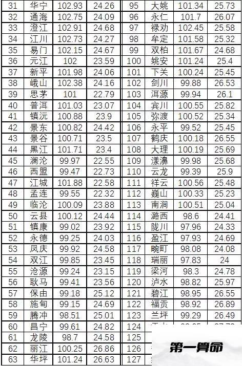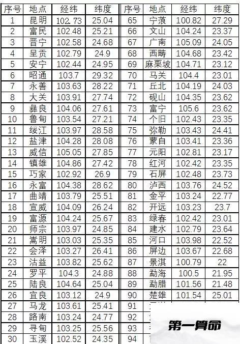 云南各地区大致经纬度坐标如下表: