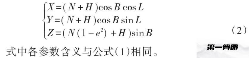 (2)大地坐标系转换成空间直角坐标系。同一基准下,某点的大地坐标系(B, L, H)和空间直角坐标系(X,Y,Z)间的转换公式为:
