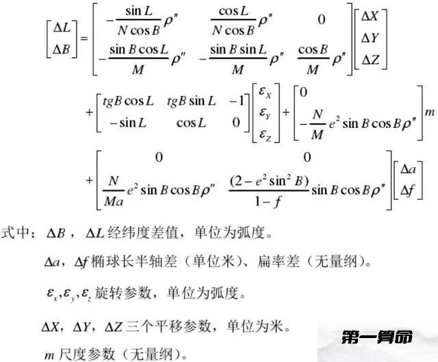 小结:(1)在同一基准下的坐标转换都是严密的,而在不同的基准之间的转换是不严密的。举个例子,在WGS-84坐标和北京54坐标之间是不存在一套转换参数可以全国通用的,在每个地方会不一样,因为它们是两个不同的椭球基准。那么,两个椭球间的坐标转换应该是怎样的呢?一般而言比较严密的是用七参数法(包括布尔莎模型,一步法模型,海尔曼特等),即X平移,Y平移,Z平移,X旋转,Y旋转,Z旋转,尺度变化K。要求得七参数就需要在一个地区需要3个以上的已知点,如果区域范围不大,最远点间的距离不大于30km(经验值),这可以用三参数(莫洛登斯基模型),即X平移,Y平移,Z平移,而将X旋转,Y旋转,Z旋转,尺度变化K视为0,所以三参数只是七参数的一种特例。