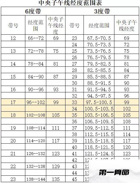 根据上表中的经度,可由下表查询得到对应的中央子午线经度及带号:
