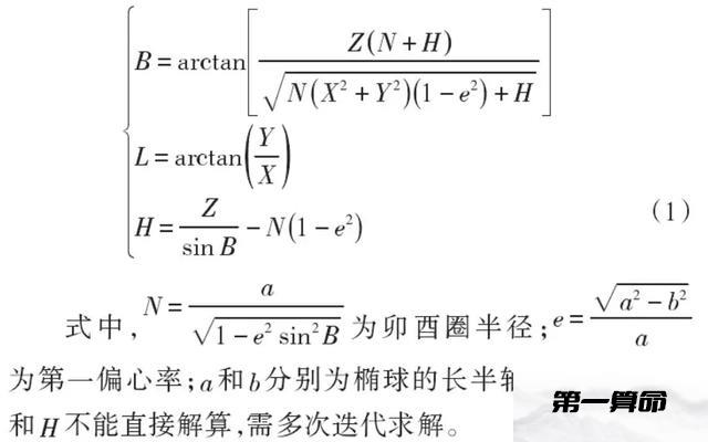 (1)空间直角坐标系转换成大地坐标系。同一基准下,某点的空间直角坐标系(X,Y,Z)和大地坐标系(B,L,H)间的转换公式为: