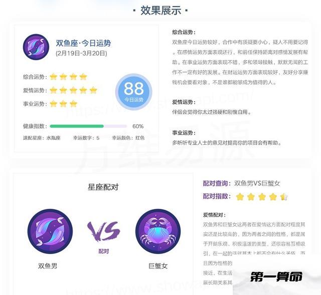 本数据包含十二星座的每日运势,明日运势,每周运势,当年运势以及星座配对。具体包括缘份星座、吉利颜色、幸运数字、爱情提醒、运势简评、爱情运势、工作运势、财富运势、健康运势、情欲分析等。可用于微信公众号、小程序、网站等引流及增加与用户的联系等场景。