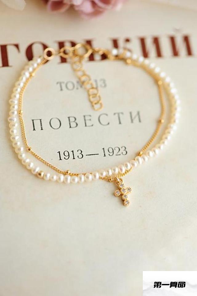 摩羯座独有的仙女手镯是普通的珍珠手镯,只有尾巴的十字架突出了不同的风格。