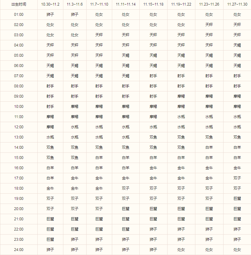 比如,如果是11月1日凌晨04:00出生的天蝎座,查询上表,可以得出自己的上升星座是天秤座。