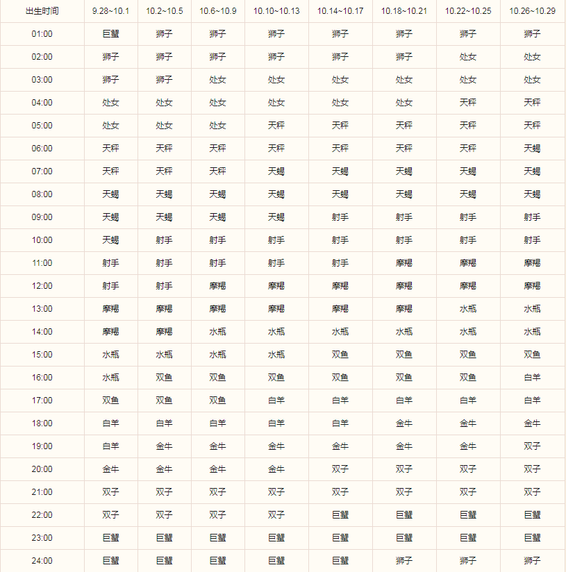 根据上面的表格,天蝎座就可以用自己的出生时间,来查询到自己专属的上升星座了。