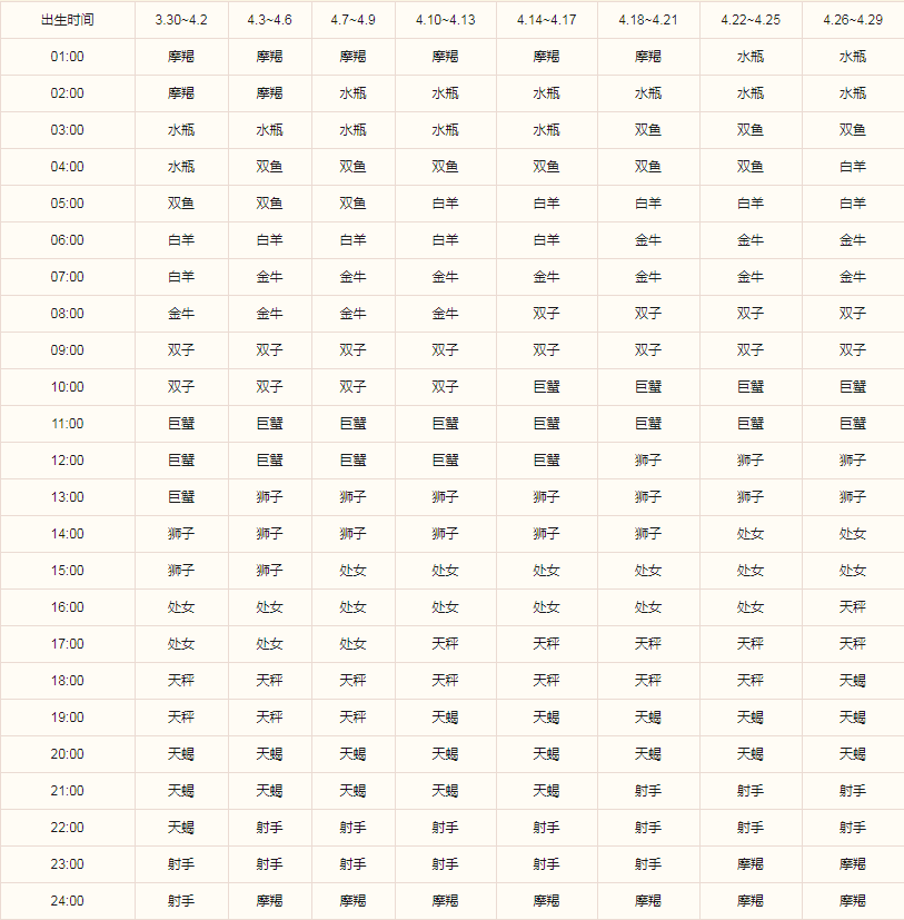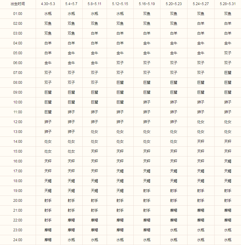 比如,如果是5月1日凌晨04:00出生的金牛座,查询上表,可以得出自己的上升星座是白羊座。