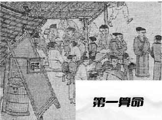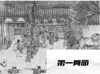 问命。在医店对面,画家画了一个算命店,外面挂着一个解字招牌,周围是一群算命师。此时开封城算命最繁荣,清明节后两周,每三年进士一次。考试前,士子们要找算命先生算一卦。难怪有一群人穿着相似,看起来很老,虔诚地围着一个算命的老人,算命的老人拿着扇子,抬起头,一个接一个地说什么。画家在最后画了这个生命的场景,表达了他对未来社会的担忧,不知道大宋皇帝的浩瀚未来。