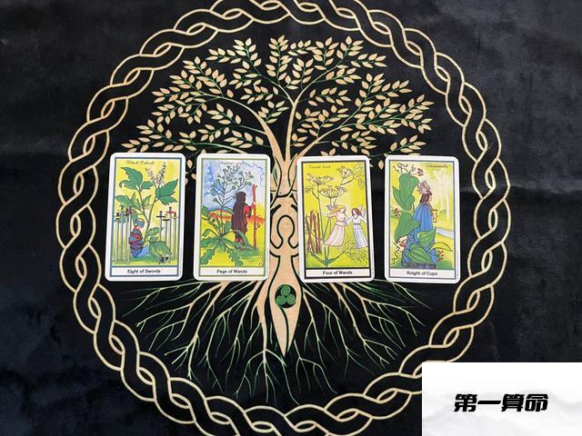 第一组牌:剑八 权杖侍从 权杖四 圣杯骑士