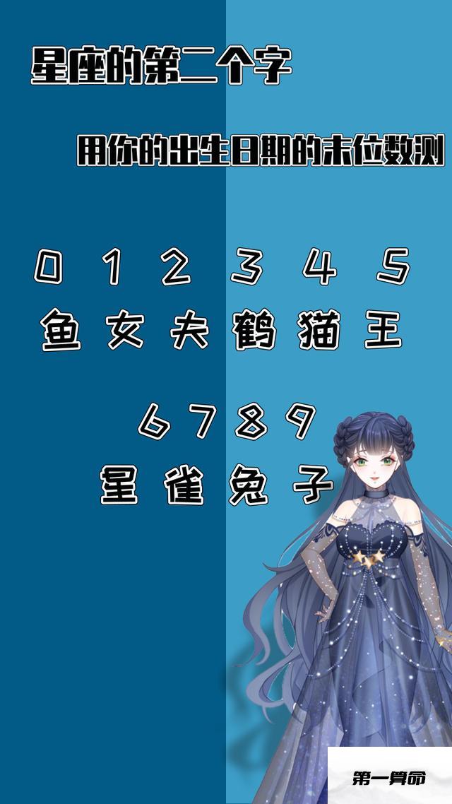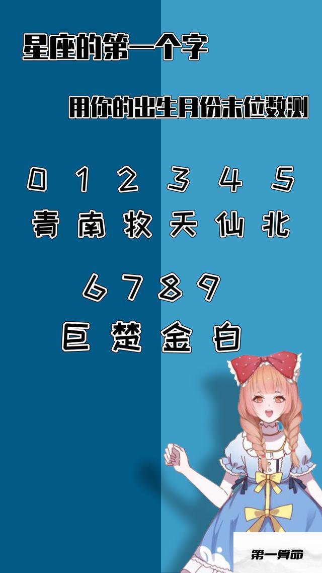 星座的第一个字,是用你的出生月份的末位数来测,比如你是8月,对应的数字是8,那就是金,如果你是12月,对应的末位数为2,那就是牧。