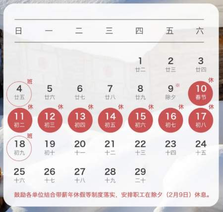 二、春节:2月10日至17日放假调休,共8天。2月4日(星期日)、2月18日(星期日)上班。鼓励各单位结合带薪年休假等制度落实,安排职工在除夕(2月9日)休息。